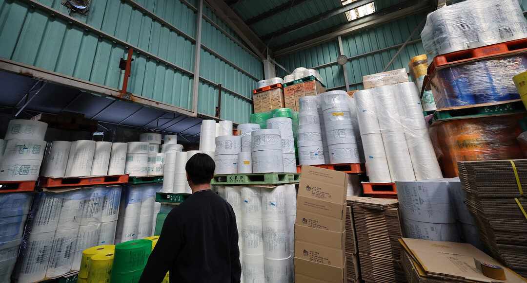 중동 전쟁 장기화로 나프타 등 원료 수급에 어려움을 겪고 있는 가운데 2일 인천 미추홀구의 한 비닐봉투, 종량제 봉투 제조 공장에서 생산된 종량제 봉투가 쌓여 있다. 2026.4.2