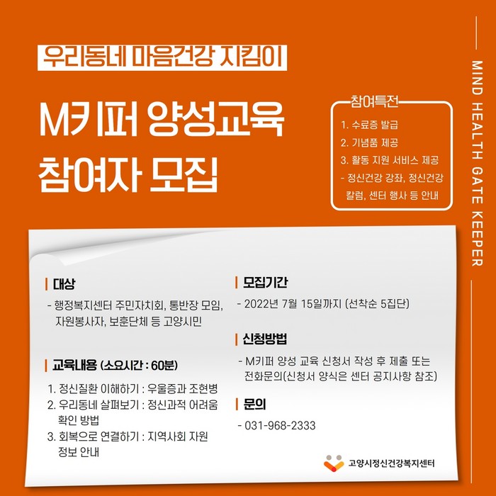 우리동네 마음건강지킴이(M키퍼) 양성 교육은 정신질환에 대한 이해, 지역사회 자원 안내, 센터 소개 및 의뢰 방법을 안내하는 내용으로 진행된다. 신청대상은 고양시에 거주하는 일반시민으로 행정복지센터 주민자치회, 통반장 모임, 사회복지시설 자원봉사자, 보훈단체 등이 참여할 수 있다.