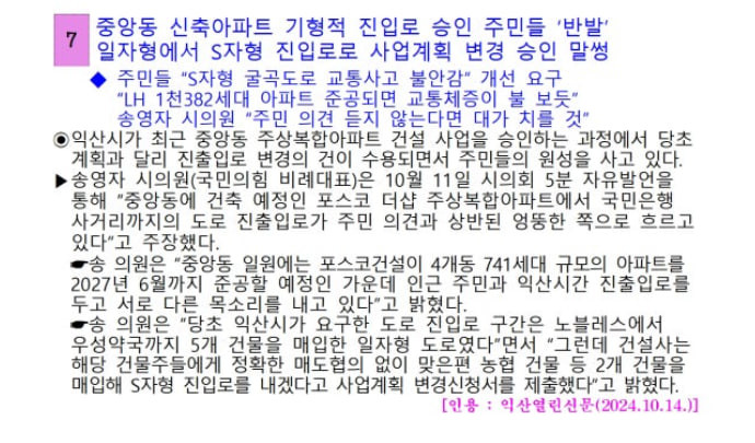 건설업체가 4차선 도로를 확보하기 위해 내놓은 ‘농협 건물 쪽 매입’ 진입로 확보 방안 때문이다. 만약에 농협 건물을 확보한다면 S자형 기형적 진입로로 교통 혼잡이 우려되는 상황에 반발하여 익산 시청 정문 1인 시위를 진행 중이다. 농협 관계자는 응답을 하지 않은 것으로 알려졌다.