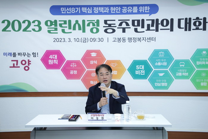 이동환 시장은 10일 오전 고봉동 행정복지센터에서 주민 100여명이 참석한 가운데 ‘주민과의 대화’를 열고 “지난달 구청별로 통장들과 간담회를 진행한 결과 시정에 대한 관심이 매우 크다는 것을 알게 됐다”면서 “시민과 더 가까이 소통하고자 동별로 대화의 시간을 마련하게 됐다”고 취지를 설명했다.