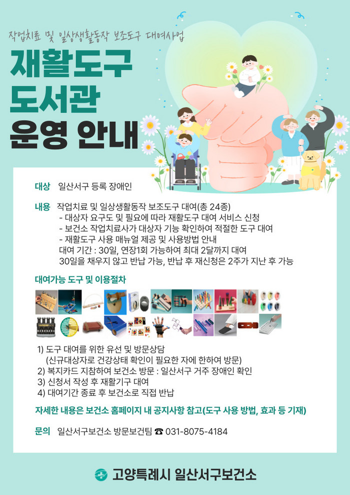 [부자동네타임즈 김인수기자] 일산서구보건소가 일산서구 등록 장애인을 대상으로 ‘재활도구 도서관’ 사업을 운영한다. 의료기관 방문이 어려운 재가 장애인 등 관내 등록 장애인은 재활도구 도서관에서 작업치료 및 일상생활동작 보조도구를 대여할 수 있다.
