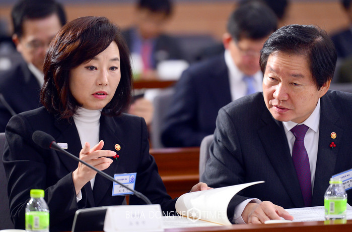 조윤선(왼쪽) 문화체육관광부장관과 김영석 해양수산부장관이 6일 오전 서울 종로구 정부서울청사 별관 국제회의장에서 열린 미래창조과학부·문화체육관광부·농림축산식품부·해양수산부·방송통신위원회 업무보고에 참석, 대화하고 있다. 2017.01.06.
