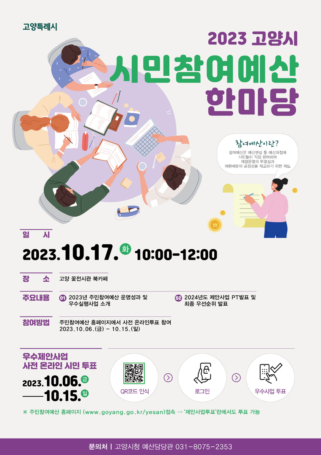 [부자동네타임즈 = 김인수 기자] 오는 17일 오전 10시부터 ‘고양특례시 시민참여예산 한마당’행사를 일산호수공원 고양꽃전시관(북카페)에서 개최한다.