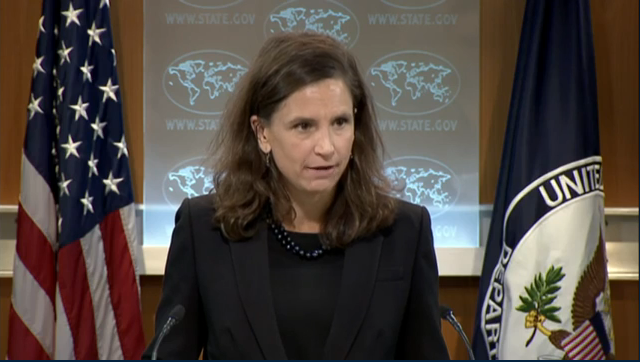 | △ 엘리자베스 트뤼도 미국 국무부 공보국장이 2일 정례브리핑에서 한·일 위안부 문제 조기타결 협의 가속화 합의를 환영한다는 입장을 밝히고 있다. <사진출처=미국 국무부 홈페이지 캡쳐> |