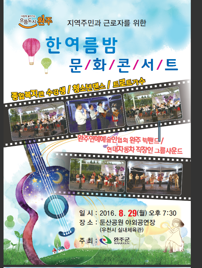 이번 문화콘서트는 완주출신 연예예술인총협회 완주지회 빅밴드 열정적인 무대와 둔산지역 청소년 댄스와 현대무용, 완주종합복지관 수강생들이 그 동안 배우고 익힌 갖가지 수준급의 연주와 노래 등을 선보여 지역주민과 근로자들이 서로 소통하고 다함께 호응하는 계기가 되었다.