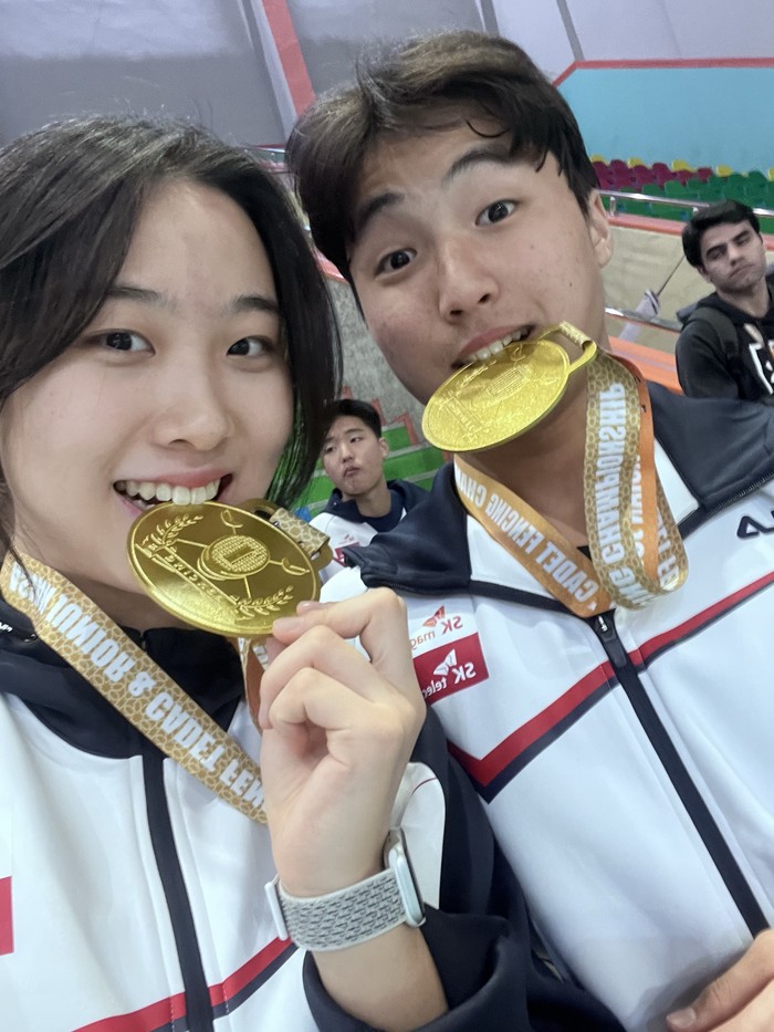 [사진설명] 지난3월 2일 우즈베키스탄에서 열린 2023 아시아 유소년 청소년 펜싱 선수권 대회에서 우리나라 신민채 선수(왼쪽)와 남호현 선수(오른쪽)가 금메달을 획득하는 쾌거를 거두었다.