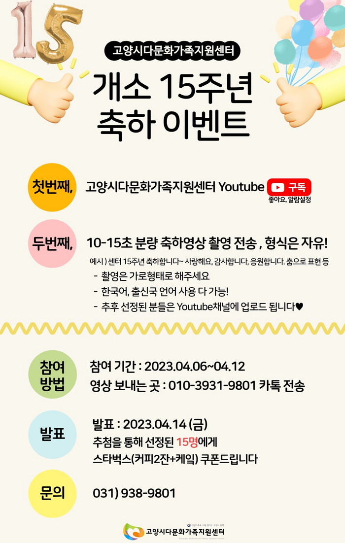 [부자동네타임즈 김인수기자] 고양시다문화가족지원센터가 올해로 15주년을 맞는다. 센터는 4월 15일 개관기념일을 앞두고 회원들과 지역주민을 대상으로 온라인 이벤트를 진행한다.