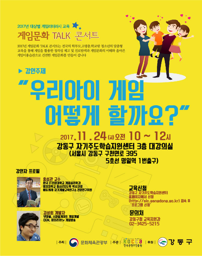 ‘게임문화 토크 콘서트’는 문화체육관광부가 주최하고 한국콘텐츠진흥원이 주관하며 강동구가 진행한다. 학부모들에게 게임을 즐겨하는 자녀들을 올바르게 지도하는 방법, 게임을 활용한 창의성 제고 및 진로탐색 방안 등을 알려 건전한 게임문화를 만들어가기 위해 기획됐다.
