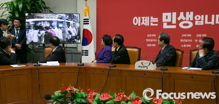 이날 오전 열린 새누리당 최고중진연석회의에서는 시작에 앞서 의경 출신의 20대 청년이 촬영한 14일 시위현장 모습이 담긴 동영상이 재생됐다.