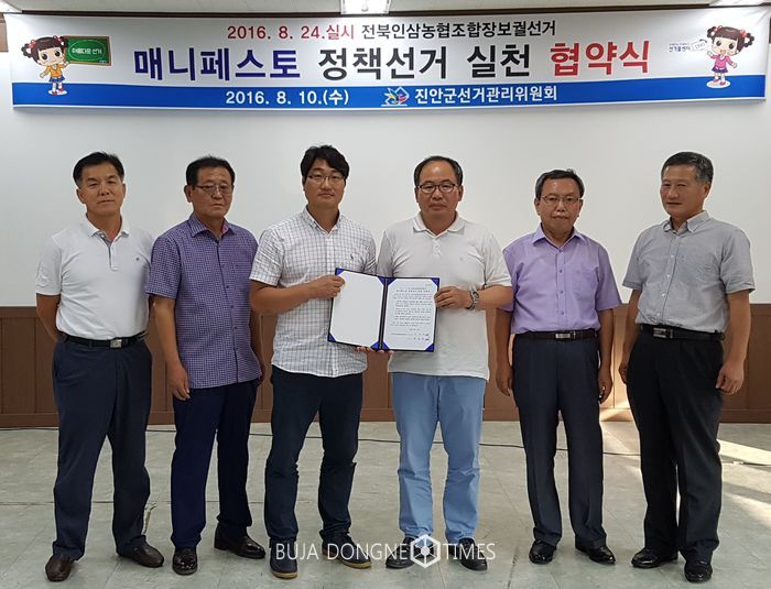이날 협약식은 정책경쟁을 통한 깨끗하고 공정한 선거를 이루기 위해서 후보자등록 마감 후 전북인삼농협조합장선거에 입후보한 후보자 2명을 대상으로 매니페스토 홍보 및 정책선거 실천 서약서 작성 등으로 진행됐다.