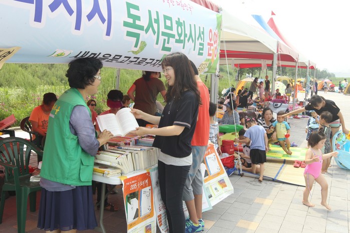 구로구는 안양천 우안둔치에 조성된 물놀이장 내에 천막부스를 설치하고 아동, 일반도서 등 500여권 책을 비치했다.