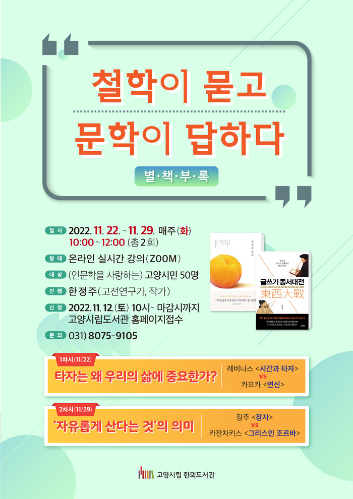 [부자동네타임즈 김인수기자] 고양특례시(시장 이동환) 한뫼도서관이 「철학이 묻고 문학이 답하다 <별·책·부·록>」 강연을 온라인으로 운영한다. 강연은 고전연구가 한정주 작가가 진행을 맡을 예정이다.