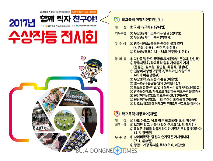 입상한 작품들은 방학 후 개학기를 맞아 학교폭력 발생에 대한 우려를 없애고 친구들과 함께 사진을 찍으며 자발적으로 학교폭력에 대해 생각하는 시간을 마련하는 취지의 공모전으로 북구지역 초·중·고 총 34학교 140작품이 참가했으며, "사진공모전"과 "표어공모전"의 두 부문 진행, 각 부문별 대상 1, 최우수상 2, 우수상 2 및 장려상 10(사진 공모) 총 20 작품을 수상작으로 선정하였으며 수상자에게는 광주경찰청장, 결찰서장상장과 수상품이 수여된다.