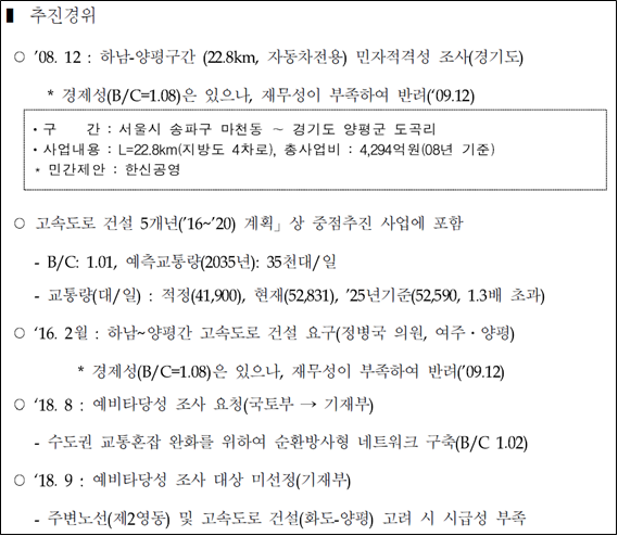 - 사타 당시 서울-양평 노선의 B/C값이 1.02로 나타나 경제성 입증, ‘양서면 종점안이 경제성에서 불리’ 국토부 주장 신빙성 떨어져.
