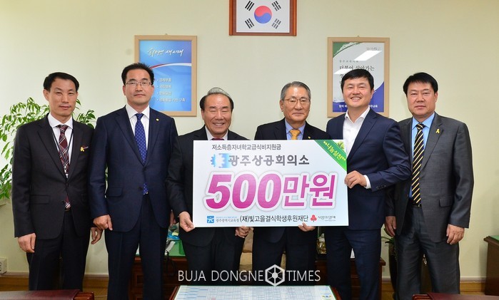 광주상공회의소(회장 김상열)가 11일 고등학교 저소득층 자녀 학교급식비 지원금 5백만원을 (재)빛고을결식학생후원재단에 전달했다.