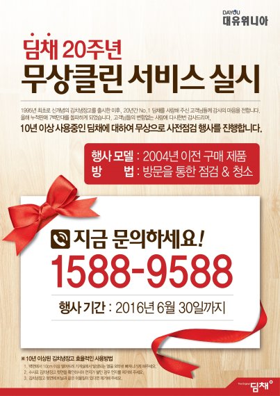 기간 내에 대유위니아 고객상담실(1588-9588)에 무상 점검을 요청하면 사용 중인 김치냉장고 제품에 대한 점검 및 청소, 올바른 사용방법 등을 무상으로 점검 받을 수 있다.