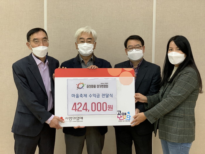 중산1동 마을축제추진위원회는 지난 마을축제 기간 중 발생한 수익금 846,600원을 새마을 부녀회 사랑의 김장김치 나눔 행사에 기부하고, 지역사회보장협의체에 140,000원을 지정 기탁하였다. 또 중산동 상가번영회와 강아지똥어린이도서관도 기부에 동참하여 마을축제 수익금 424,000원과 186,390원을 각각 지역사회보장협의체에 기탁하였다.