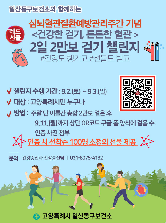 한편 보건소는 심뇌혈관질환예방관리 주간을 기념하여 9월 2일부터 3일까지 ‘건강한 걷기, 튼튼한 혈관 2일 2만보 걷기 챌린지’를 진행해 건강 생활 실천을 도모할 계획이다.