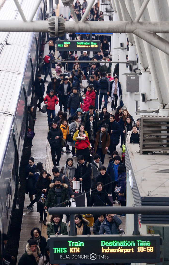설 연휴 사흘째 본격적인 귀경행렬이 이어진 29일 오전 서울역에서 귀경객이 기차역 플랫폼을 빠져나오고 있다. 2017.01.29.