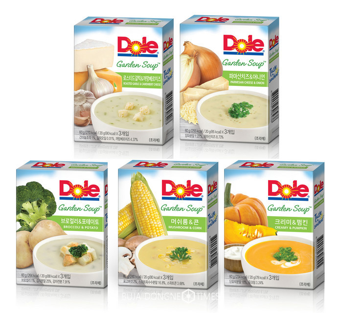 DOLE(돌)의 ‘돌 가든스프’는 야채, 치즈 등 신선한 원재료를 사용하여 스프의 진한 풍미와 풍부한 식감을 느낄 수 있는 제품이다. 1인분씩 담긴 파우치 타입의 소포장으로 출시되어 뜨거운 물만 부으면 간편한 아침 식사로 활용이 가능하다. 로스티드갈릭&까망베르치즈, 브로컬리&포테이토, 파마산치즈&어니언, 머쉬룸&콘, 크리미&펌킨 총 5가지 종류로 구매할 수 있다. 간편하게 활용 할 수 있어 추운 겨울 직장인들을 아침 식사나 간식 등으로 적합하며, 어린 자녀들의 겨울철 간식으로도 활용 할 수 있다.