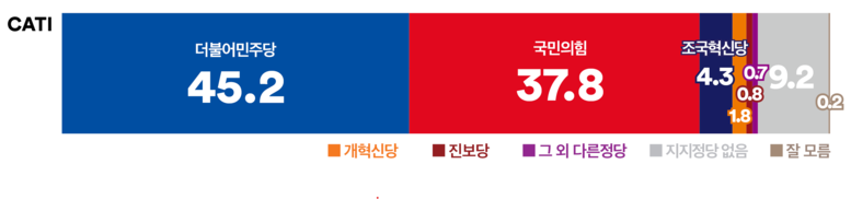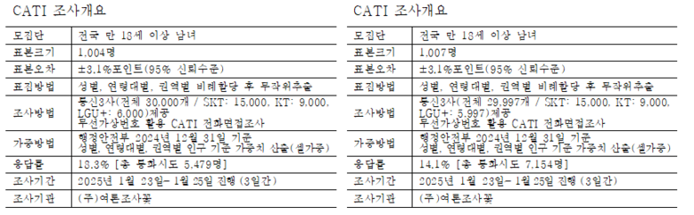 ‘여론조사꽃’이 2025년 1월 23일부터 25일까지 사흘간 실시한 전화면접조사에서 ‘더불어민주당’의 지지율은 47.0%, ‘국민의힘’은 36.5%로 집계되었으며, 양당 간 격차는 10.5%p로 오차범위 밖의 격차로 나타났다. 또한 ‘더불어민주당’과 ‘조국혁신당’의 합산 지지율은 51.9%로 ‘국민의힘’ 지지율(36.5%)을 15.4%p 차이를 보였다.