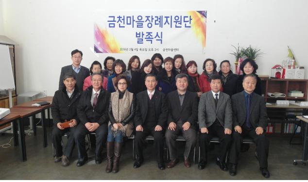 △ <금천장래지원단 ‘두레’ 발족식/ (이은춘 금천마을장례지원단 단장(맨 앞줄 왼쪽에서 네 번째), 송유근 금천구청 사회복지과장(맨 앞줄 오른쪽에서 세 번째)) |