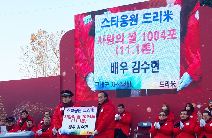 [부자동네타임즈 이현진 기자] 키이스트는 2일 "배우 김수현이 1일 서울광장에서 열린 구세군 자선냄비 시종식에서 자선냄비에 사랑의 쌀 1004포(11.1톤)를 기부하며 자선냄비 사랑의 쌀 기부의 첫 테이프를 끊었다"고 밝혔다.