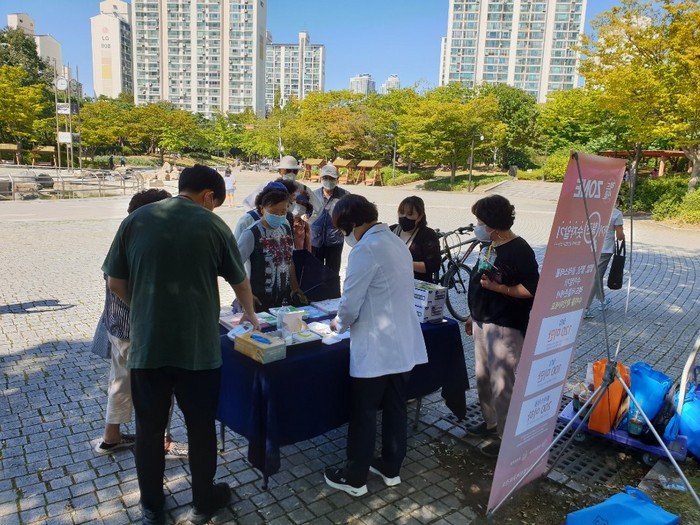 [사진설명] 공원에서 열린 레드서클 캠페인에 시민들이 관심을 보이고 있다.