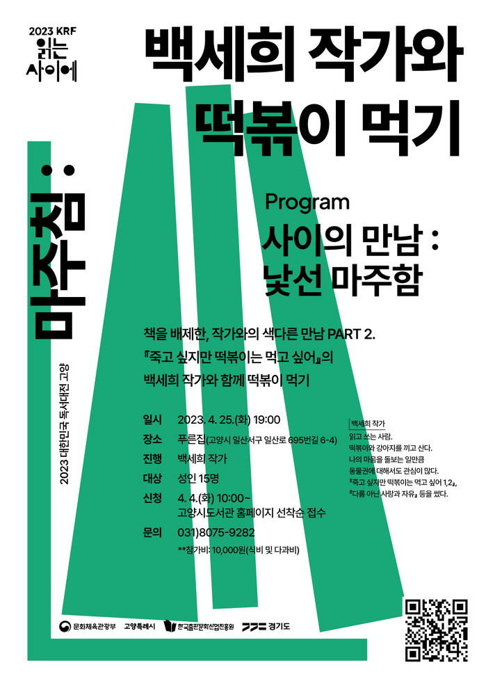 [부자동네타임즈 김인수기자] 2023 대한민국 독서대전을 유치해 다양한 책의 도시 연중 프로그램을 전개하고 있다. 이번에는 ‘○○작가와 ○○하기’ 두 번째 시간으로 오는 4월 25일 (화) 저녁 7시 백세희 작가와 떡볶이 먹기 특별한 데이트가 기다리고 있다.