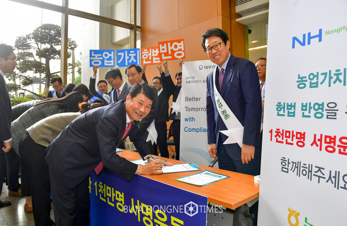 NH농협은행 기업투자금융부문 박규희부행장은 “농업의 공익적 가치가 헌법에 반영되기 위해 국내 생산활동의 대다수를 차지하는 개인사업자 및 기업에 대해 이달말까지 지속적인 캠페인과 서명활동을 실시할 계획”이라고 말했다.