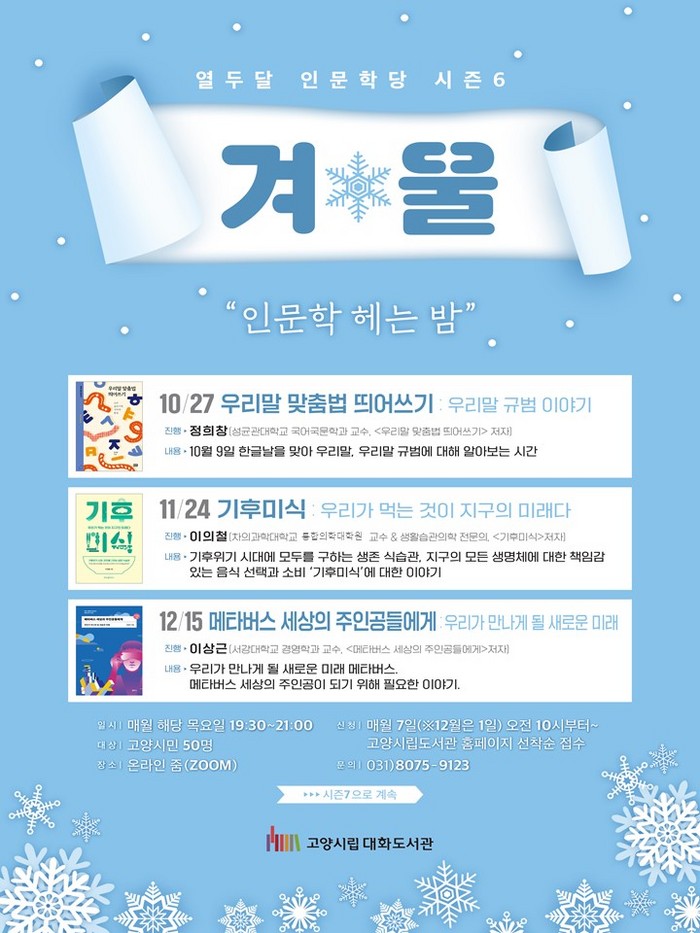 [부자동네타임즈 김인수기자] 고양특례시(시장 이동환) 대화도서관의 대표 인문학 프로그램인 열두달 인문학당 시즌6의 겨울편이 10월 27일부터 시작된다.