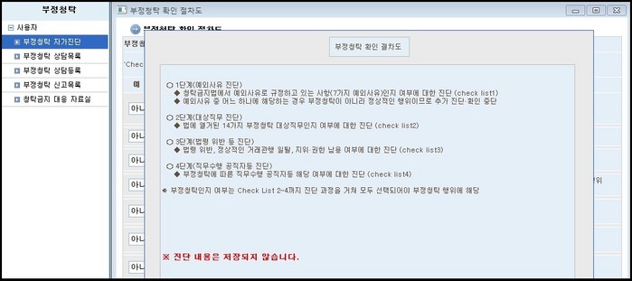 ‘청탁확인 자기진단’은 청탁 등록에 앞서 부정청탁인지 스스로 점검하는 단계다. 총 4단계에 걸쳐 부정청탁 여부를 확인하며 ▲청탁금지법에서 예외사유로 규정하고 있는 7가지 사항인지 ▲법에 열거된 14가지 부정청탁 대상 직무인지 ▲법령위반이나 지위‧권한 남용인지 ▲부정청탁에 따른 공직자 등에 해당하는지에 대해 점검한다.