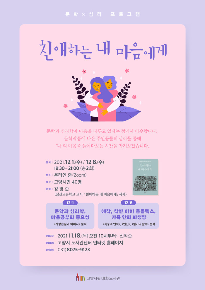 [부자동네타임즈 김인수기자] 고양시 대화도서관이 문학과 심리학을 연계한 독서문화프로그램 친애하는 내 마음에게를 12월 1일, 8일 온라인으로 운영한다.