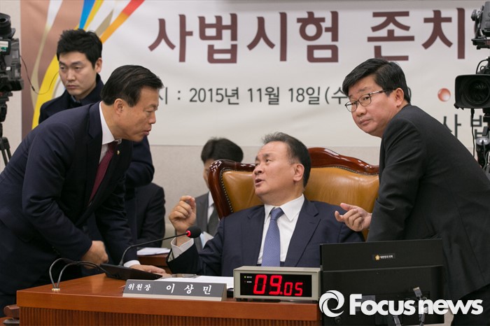 | △ 지난달 18일 오전 서울 여의도 국회 법제사법위원회 전체회의실에서 열린 사법시험 존치에 관한 공청회에서 이한성(왼쪽부터) 여당 간사와 이상민 위원장, 전해철 야당 간사 등이 법무부의 부실한 진술과 관련해 논의하고 있다. <사진제공=포커스뉴스> |