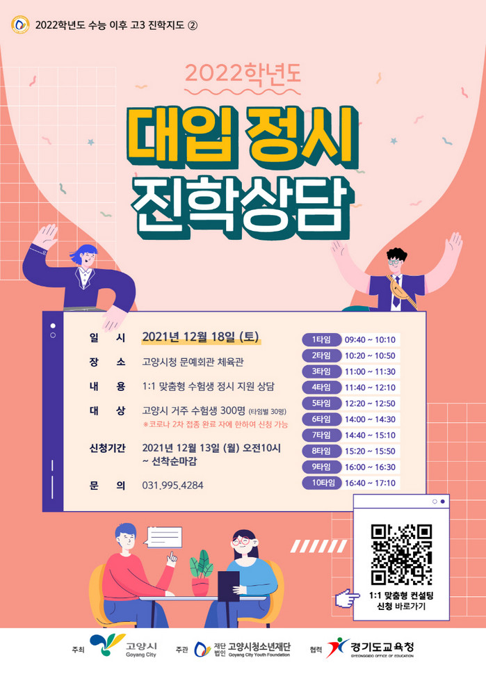 ‘고양시 2022학년도 대입 정시 진학상담’ 사전 접수신청 방법 및 기타 자세한 사항은 고양시 청소년진로센터 홈페이지나 고양시 청소년진로센터에 문의하면 된다.