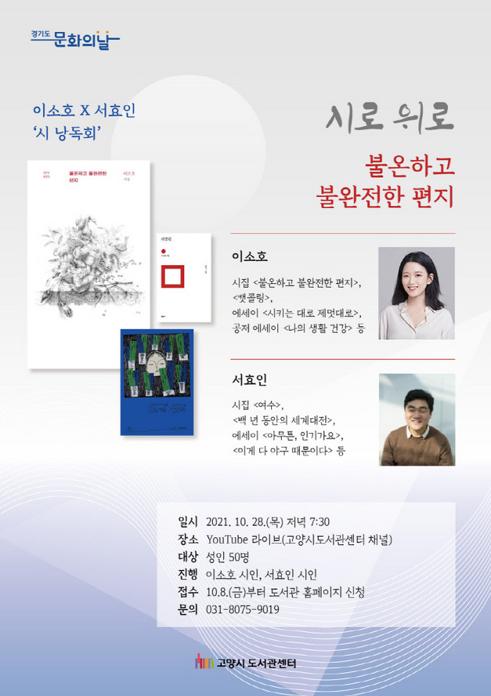 고양시 도서관은 지난 5월부터 매달 마지막 주 문화가 있는 날, 시인과 함께하는 낭독회 시로 위로를 운영하고 있다. 이번이 여섯 번째이자 마지막 시간으로 시인 겸 편집자, 출판인으로 활동하는 서효인 시인이 함께 진행한다. 낭독회는 고양시 도서관센터 유튜브 채널에서 라이브 방송으로 시청 할 수 있다.