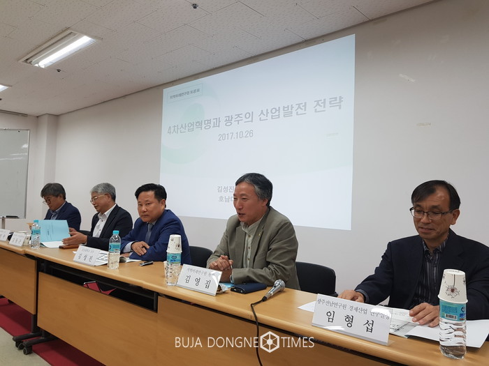 김성진 교수(전 산업지원부 대변인)는 발제를 통해 광주산업현황을 분석하고 현재의 지역육성산업이 4차산업혁명시기 10년 후의 미래변화를 담지 못하고 있는 상황이라고 분석하고, 성산업이 4차산업혁명시기 10년 후의 미래변화를 담지 못하고 있는 상황이라고 분석하고, 광센서산업 육성, 지역자동차부품기업의 전기차부품사업화, 전남 바이오산업과 협업, 에너지신산업육성 등의 미래산업 육성전략이 필요하다고 주장했다.