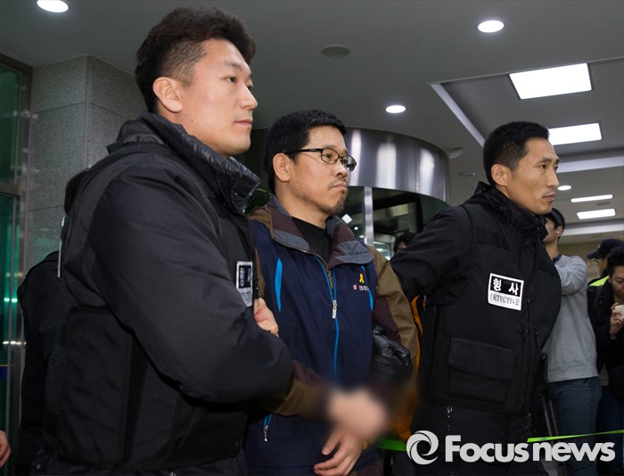 (서울=포커스뉴스) 한상균 민주노총위원장이 10일 오전 서울 중구 남대문경찰서로 압송되고 있다.