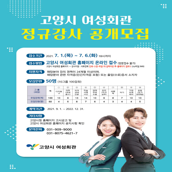 [부자동네타임즈 김인수기자] 고양시 여성회관은 7월 1일부터 고양시 여성회관 정규 강사 50명을 공개 모집한다.