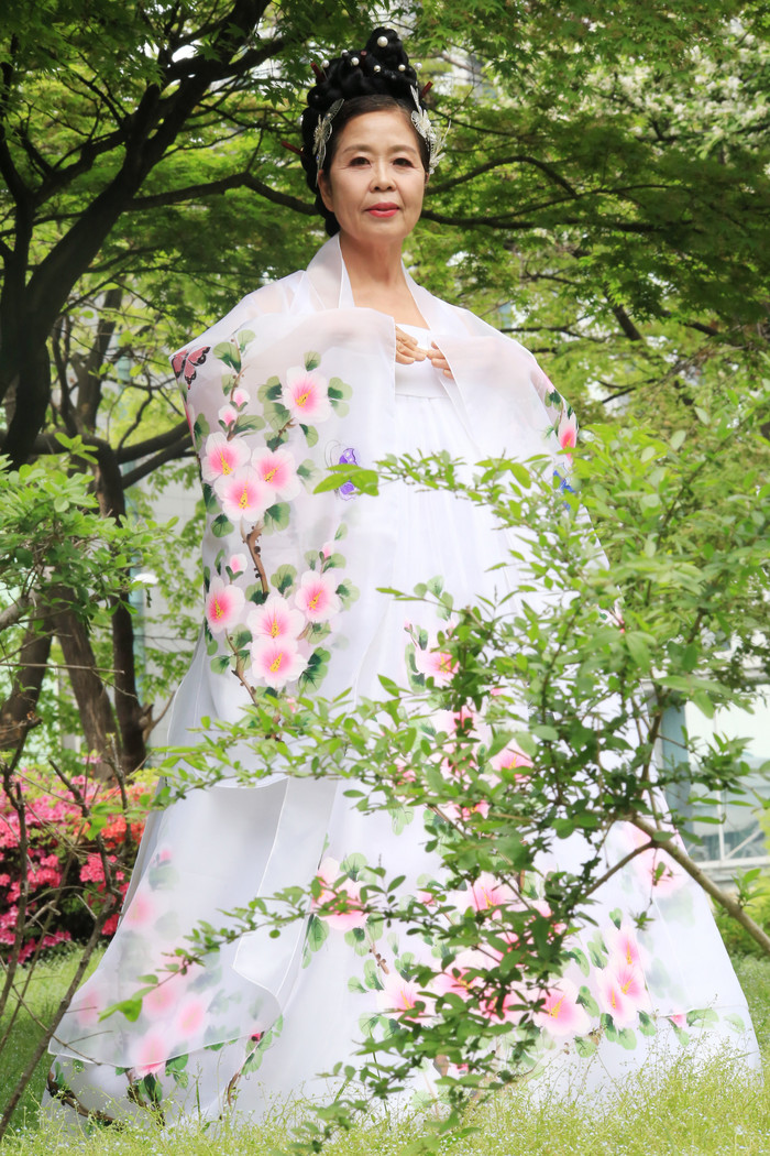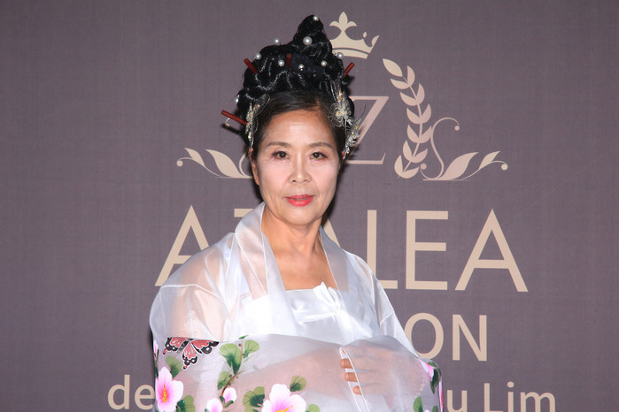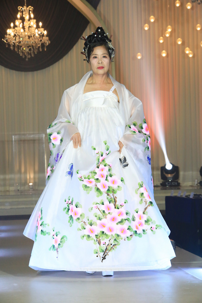 [사진설명] 2023 제1회 대한민국 무궁화퀸모델선발대회, 아젤리아 드레스 패션쇼에 참가한 성춘애 시니어모델.