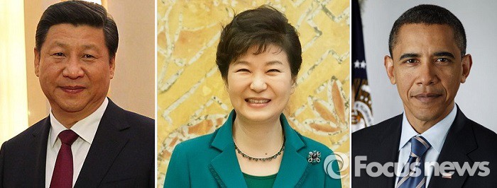| △ 이번 순방에서 남중국해 분쟁과 관련한 언급을 하지 않고 있는 박 대통령이 22일 동아시아정상회의(EAS)에서 미·중 균형외교 기조를 어떻게 이어갈지 주목된다. 사진왼쪽부터 시진핑 중국주석, 박근혜 대총령, 오바마 미국대통령.<사진제공=포커스뉴스> |