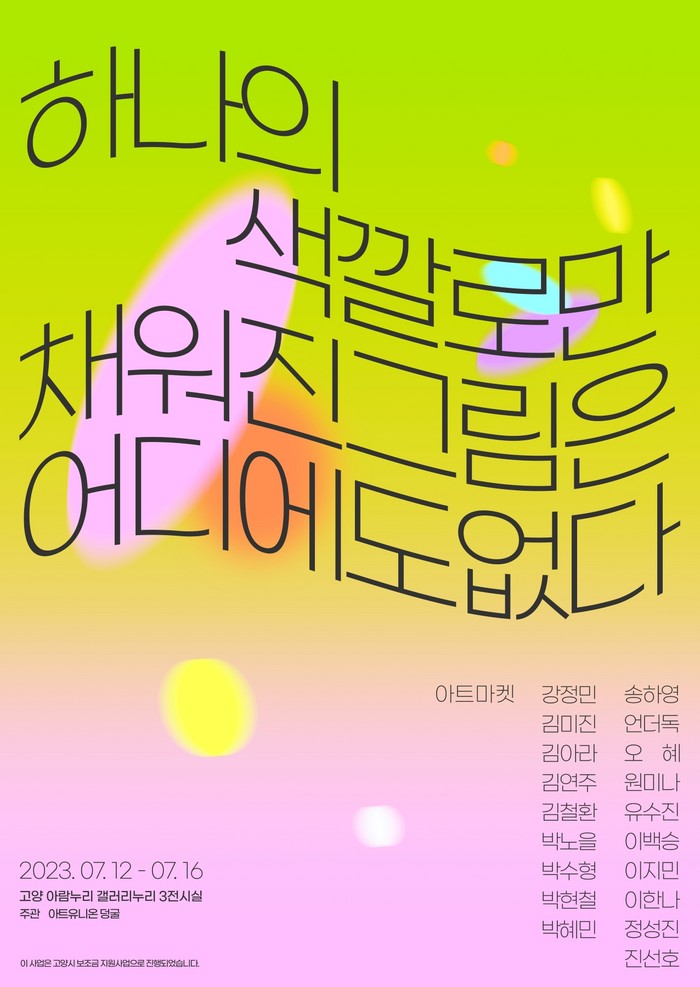 [부자동네타임즈 김인수기자] 오는 12일(수)부터 20일(목)까지 고양아람누리 갤러리누리 1관에서 ‘아트유니온 덩굴’의 첫 기획전 ‘하나의 색깔로만 채워진 그림은 어디에도 없다’를 개최한고 밝혔다.