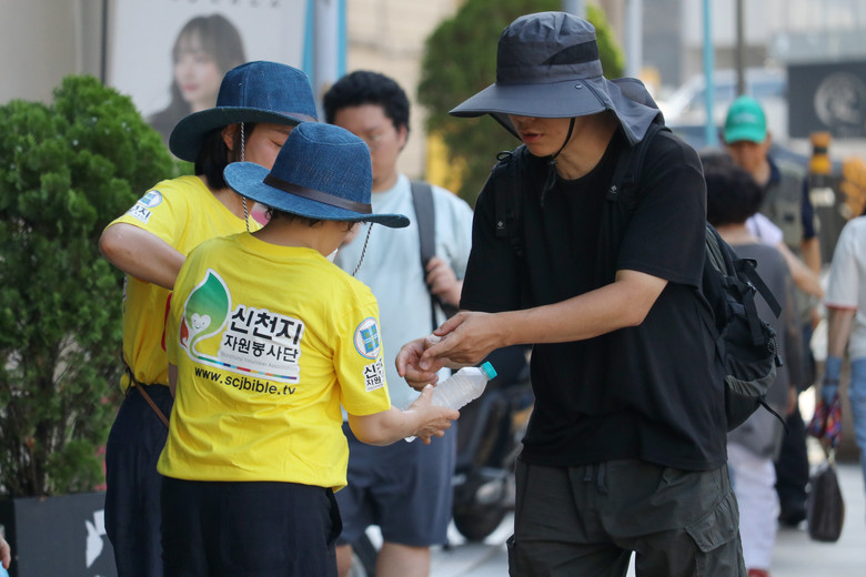 지속되는 폭염 속에서 신천지자원봉사단 부천지부(지부장 김규찬·이하 부천지부)가 온열질환 예방을 위한 봉사활동으로 생수 나눔을 실시했다.