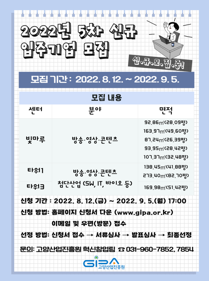 [부자동네타임즈 김인수기자] 고양산업진흥원(원장 오창희, 이하 ‘진흥원’)이 운영하는 기업입주시설에서 방송·영상, 콘텐츠, 바이오, ICT 등 첨단산업 분야의 기업을 대상으로 9월 5일까지 입주기업을 모집한다.