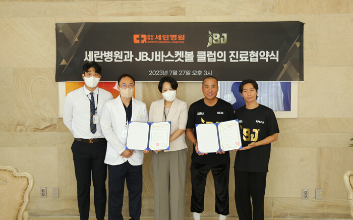 JBJ바스켓볼클럽과 세란병원은 최근 건강하고 건전한 농구발전과 활성화를 위해 진료협약을 체결했다.세란병원은 “매년 뚯깊은 주제를 가지고 농구대회를 개최하며 농구 꿈나무들에게 많은 기회와 비젼을 주는 JBJ바스켓볼클럽에 의료봉사를 무료로 지원하면서 오래도록 함께하고 싶다는 생각에협약을 진행하여 클럽 임직원 및 회원과 회원 가족까지도 혜택을 드려 건강 증진에 기여 및 양기관의 공동발전하는 계기를 만들고자 업무협약을 진행하게 되었다” 고 전했다,