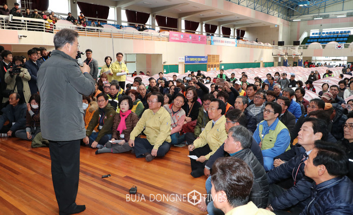 [포항=부자동네타임즈 박윤수 기자]문재인 대통령이 24일 오전 지진 피해 이재민이 머물고 있는 경북 포항시 흥해실내체육관 대피소를 찾아 시민들과 대화를 하고 있다. 2017.11.24.