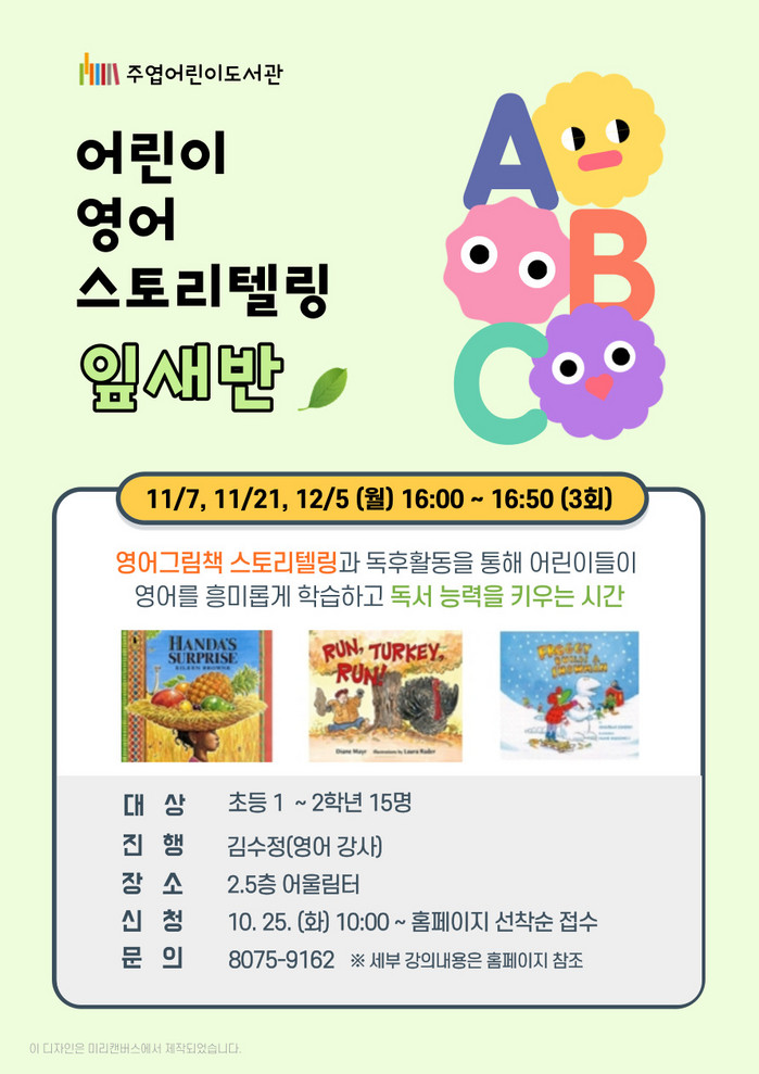 프로그램은 외국문화를 이해할 수 있는 다양한 주제의 영어 그림책을 바탕으로 스토리텔링, 영어 노래, 챈트, 게임 등 즐거운 독후 활동과 체험시간으로 구성된다. 어린이들이 듣고 말하고 생각하는 능력을 키우고 영어와 친근해지는 시간이 될 예정이다.