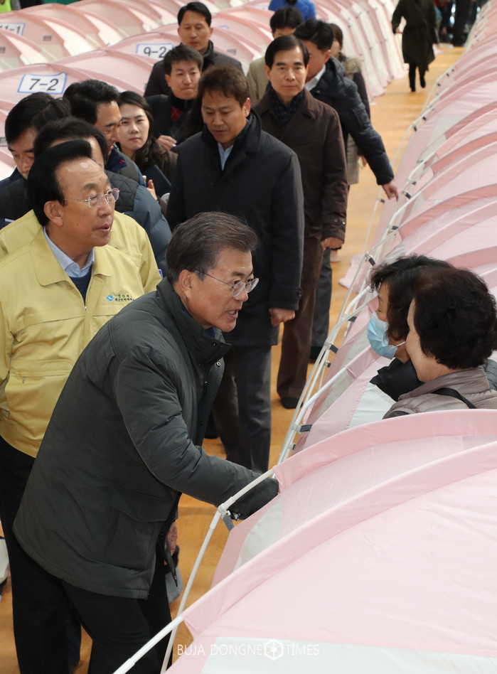 [포항=부자동네타임즈 박윤수 기자]문재인 대통령이 24일 오전 지진 피해 이재민들이 머물고 있는 경북 포항시 흥해실내체육관을 방문해 이재민들을 위로하고 있다. 2017.11.24.