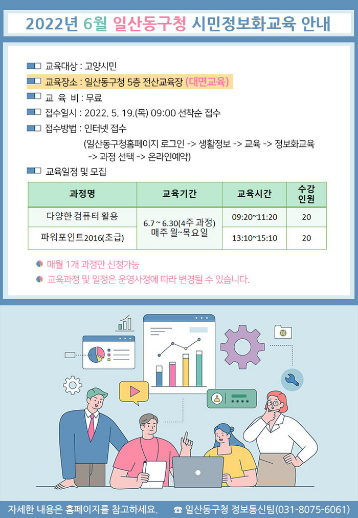 [부자동네타임즈 김인수기자] 고양시 일산동구(구청장 방경돈)는 오는 19일부터 시민정보화교육 6월 과정 수강생을 선착순 모집한다.