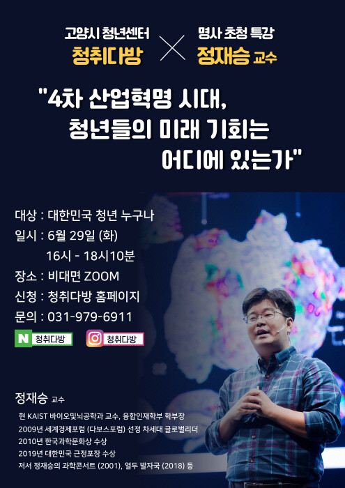 [부자동네타임즈 김인수기자] 고양시의 대표 청년공간 ‘청취다방’에서 오는 6월 29일 카이스트 정재승 교수와 함께하는 ‘명사특강’을 온라인으로 진행한다.